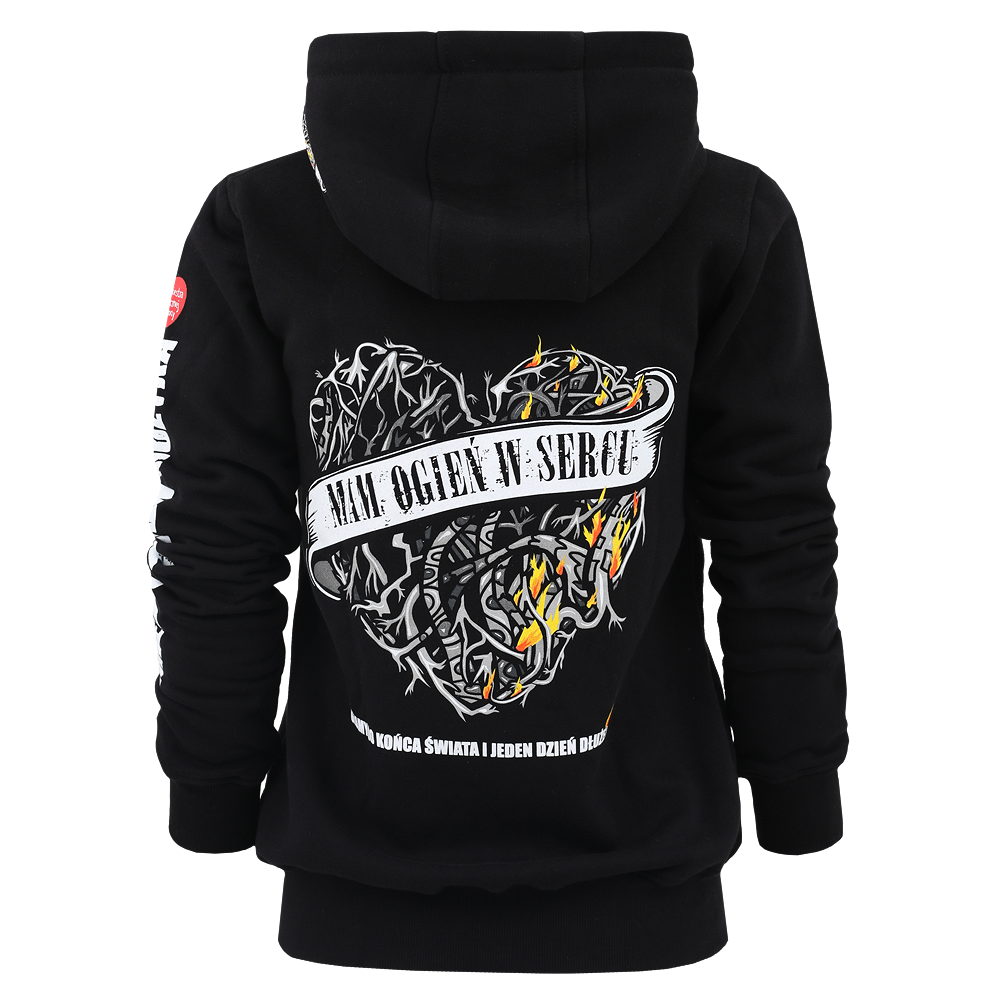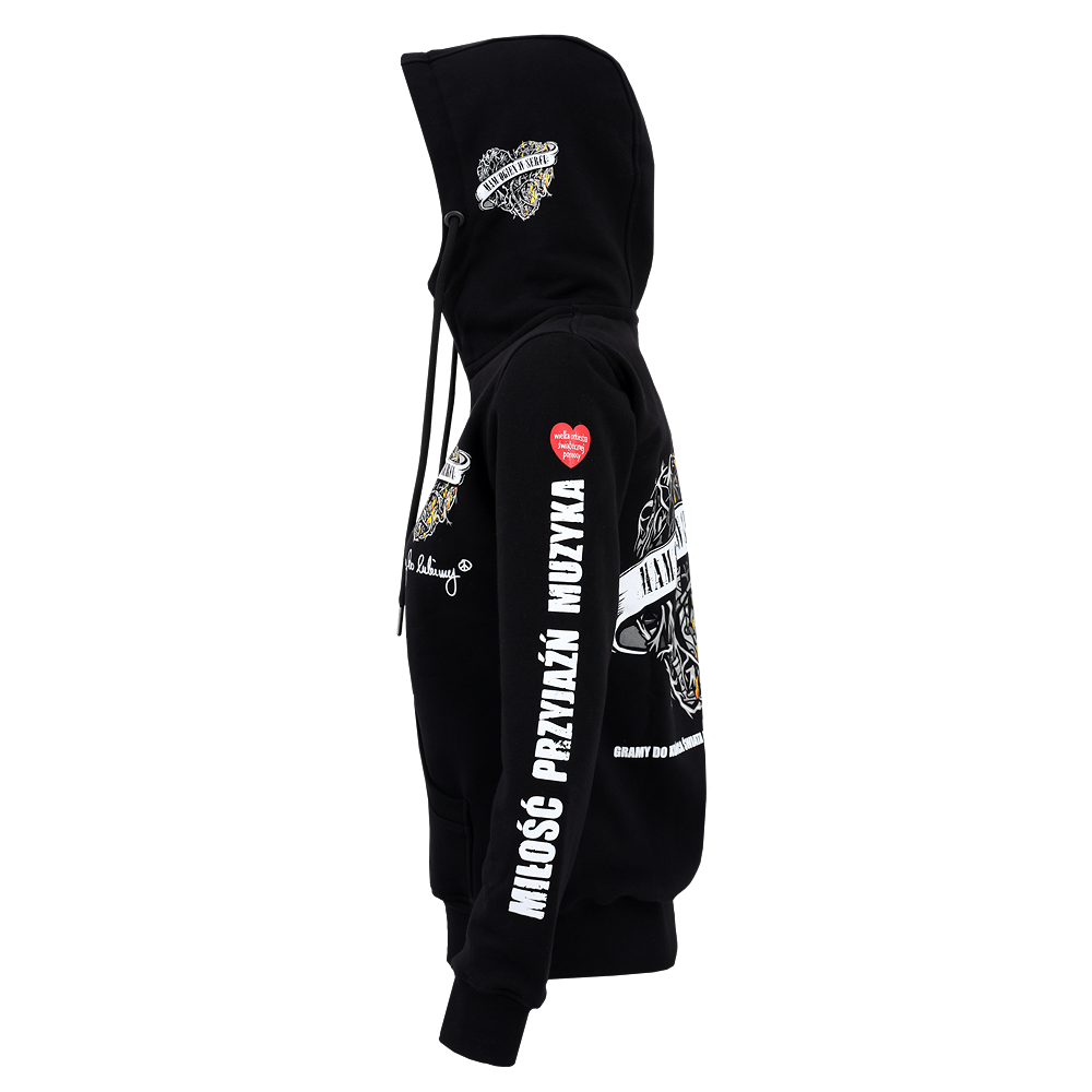 Czarna bluza z bardzo wysokiej jakości dzianiny bawełnianej Marczak z niewielką ilością poliestru (90% +10%) z nadrukowanym ciekawym motywem. Delikatny nadruk metodą sitodruku zapewnia jego trwałość oraz długotrwałe utrzymanie barwy. Dodatkowo wykończona taśmą haftowaną z logo w obrębie karku oraz tkaną wszywką firmową.