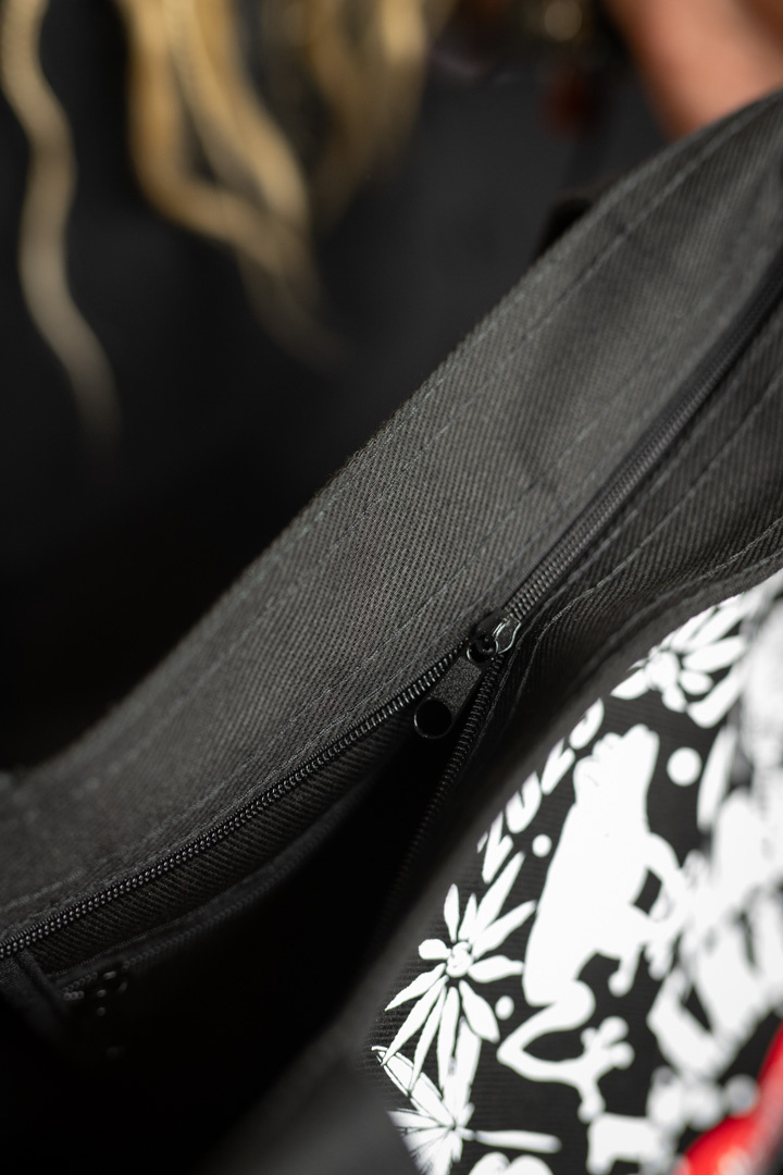 Zapinana na zamek, w środku z małą kieszonka na drobiazgi, również zapinana na zamek.