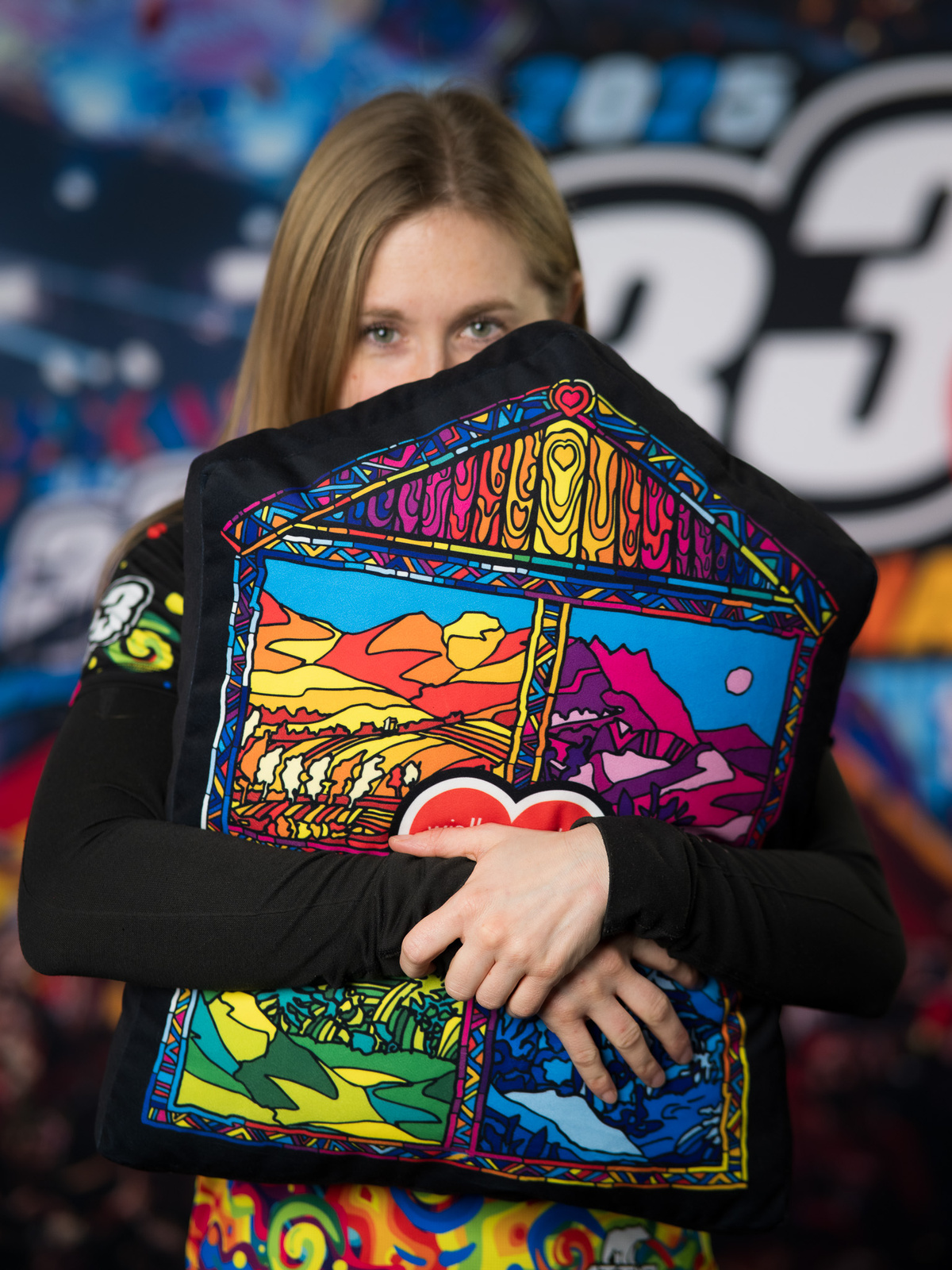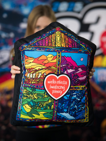 Poduszka o wymiarach 40x55 cm zachwyca żywymi kolorami i artystycznym wzorem. W centralnym miejscu znajduje się serce z logo WOŚP.